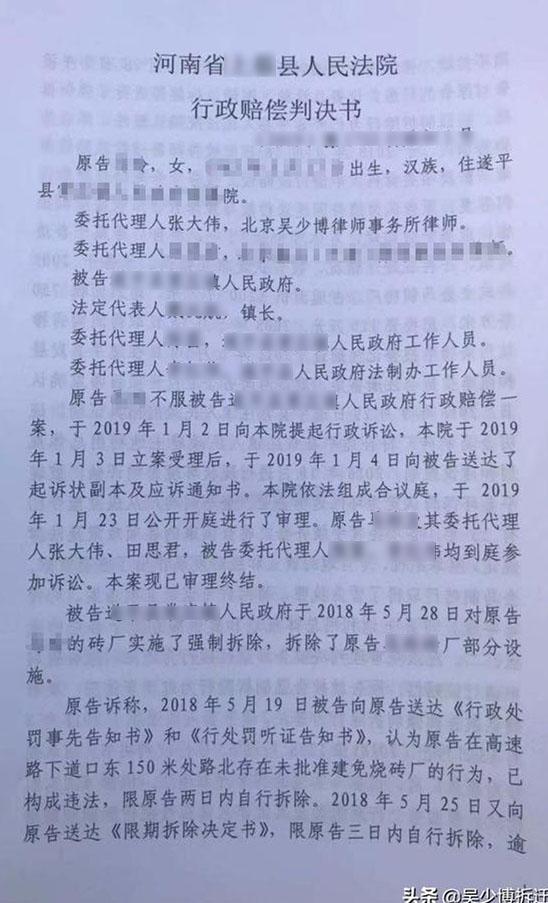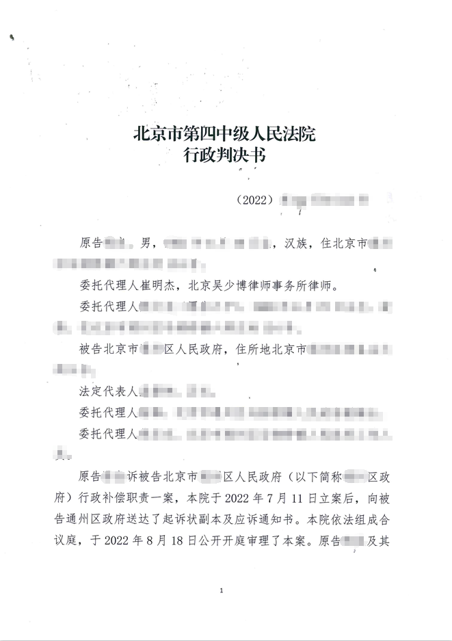 本案代理律師:北京吳少博律師事務(wù)所吳少博律師、石磊律師 本案事實(shí) 被告TS區(qū)政府于2019 年